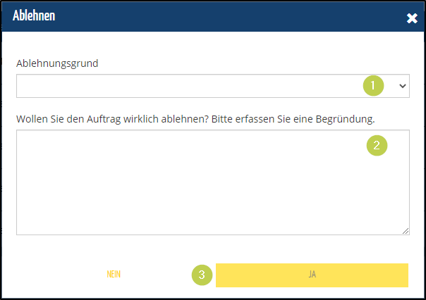 Wählen Sie in dem Dialog Ablehnen einen entsprechenden Grund (1) und erfassen Sie freien Text (2) und bestätigen mit JA (3)