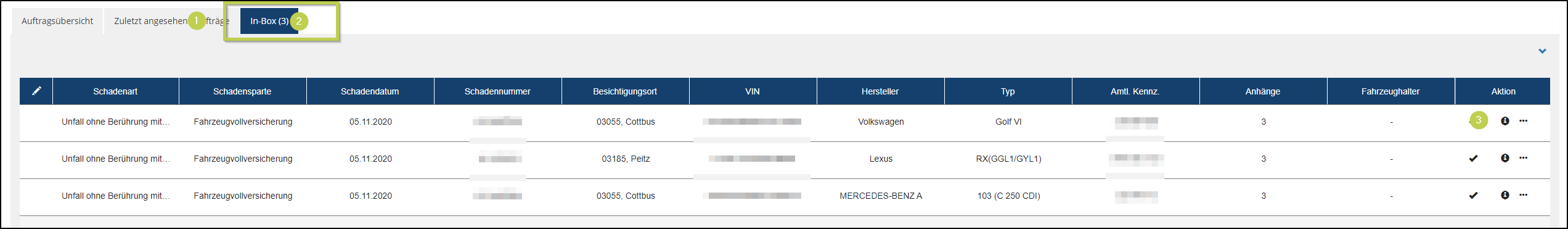 Wechseln Sie im Dashboard in den Tab In-Box (1). Die Ziffer in Klammern (2) gibt Ihnen bereits die Information über die Anzahl der Beauftragungen, welche noch nicht importiert wurden: