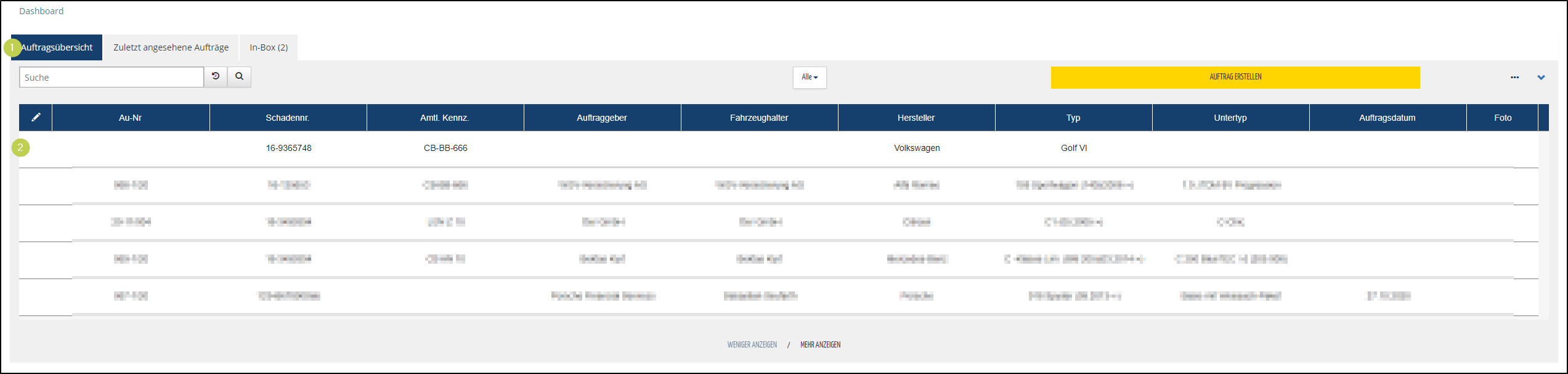 Wechseln Sie wieder in den Tab Auftragsübersicht (1). Der angenommene Auftrag (2) sollte in der Auftragsübersicht ganz oben platziert sein. Falls nicht nutzen Sie wie gewohnt die Volltextsuche:
