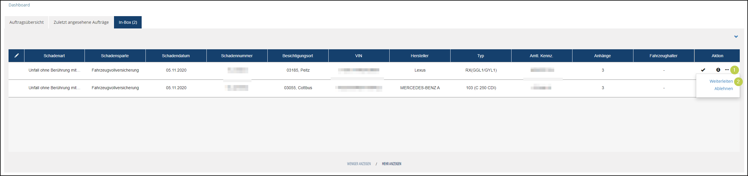 Klicken Sie in der In-Box dazu auf das 3-Punkte (1) Menü des Auftrages und wählen Weiterleiten (2) aus: