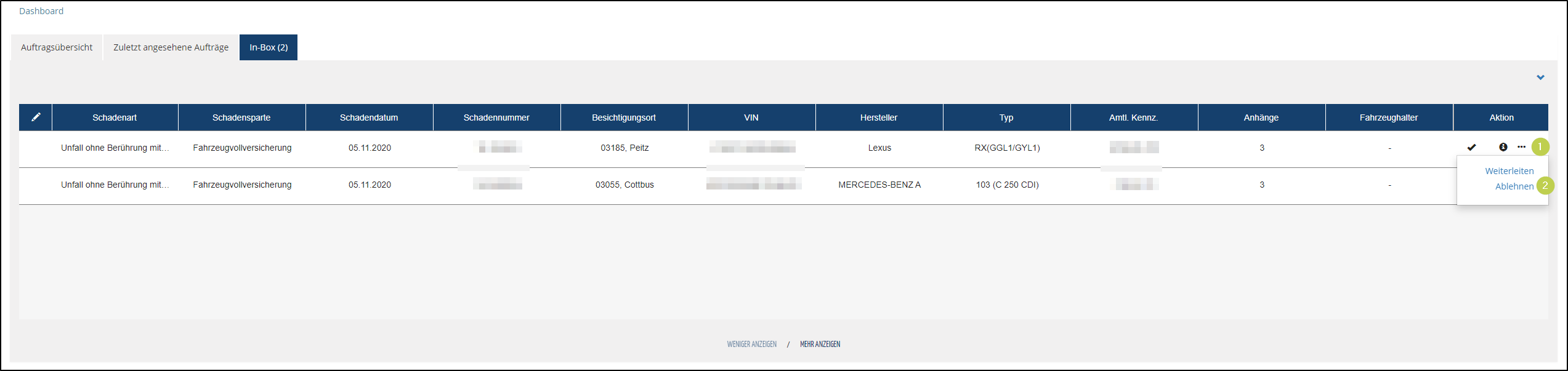 Klicken Sie in der In-Box dazu auf das 3-Punkte (1) Menü des Auftrages und wählen Ablehnen (2) aus: