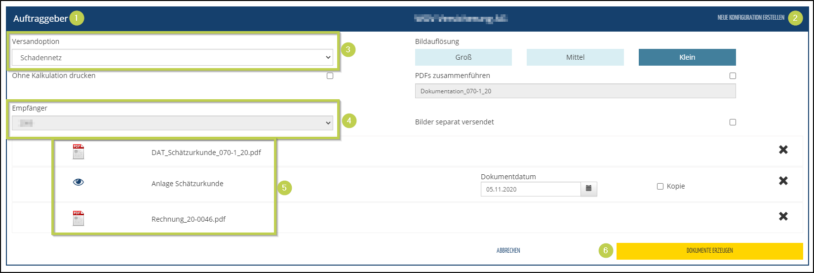 • Anschließend klicken Sie auf DOKUMENTE ERZEUGEN (6) und letztendlich auf FERTIGSTELLEN um den Auftrag zu versenden: