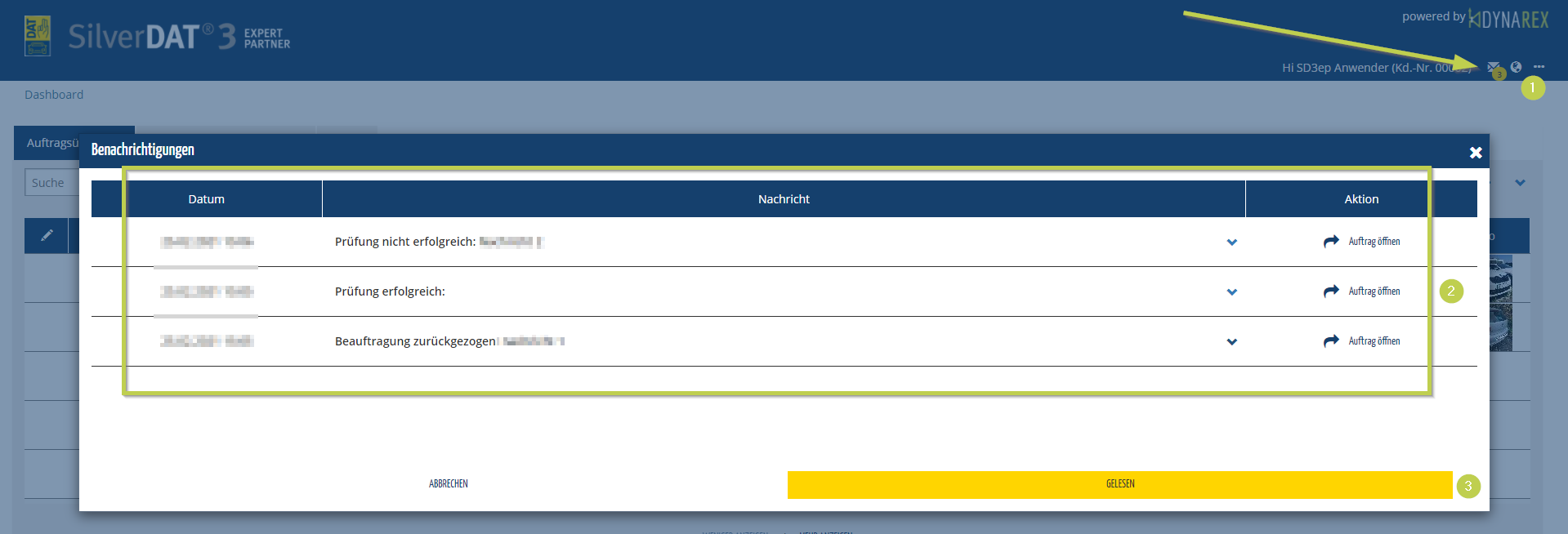 Im sich öffnenden Dialog sehen Sie alle Benachrichtigungen (2). Sie können den Inhalt der Nachrichten sehen und die Aufträge über den Link am rechten Rand direkt öffnen (2).