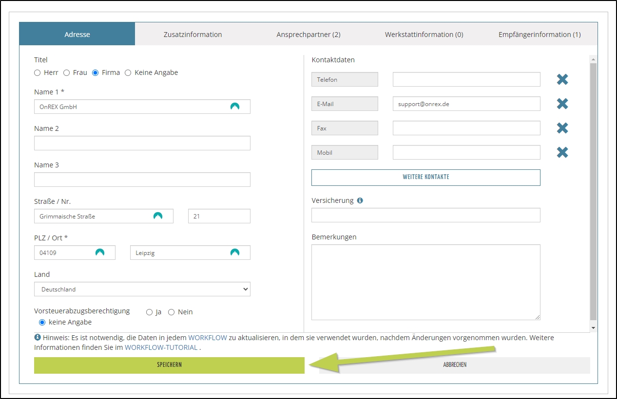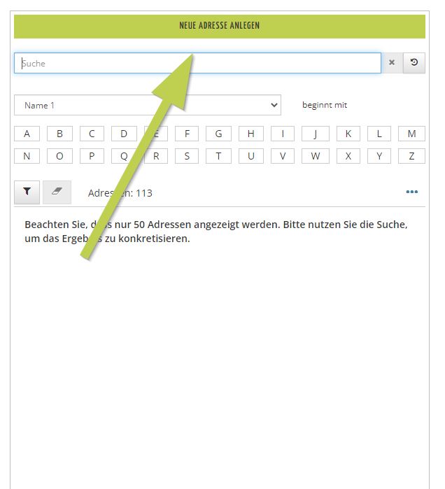 Hier haben Sie jetzt die Möglichkeit, über den großen grünen Button eine neue Adresse zu erfassen
