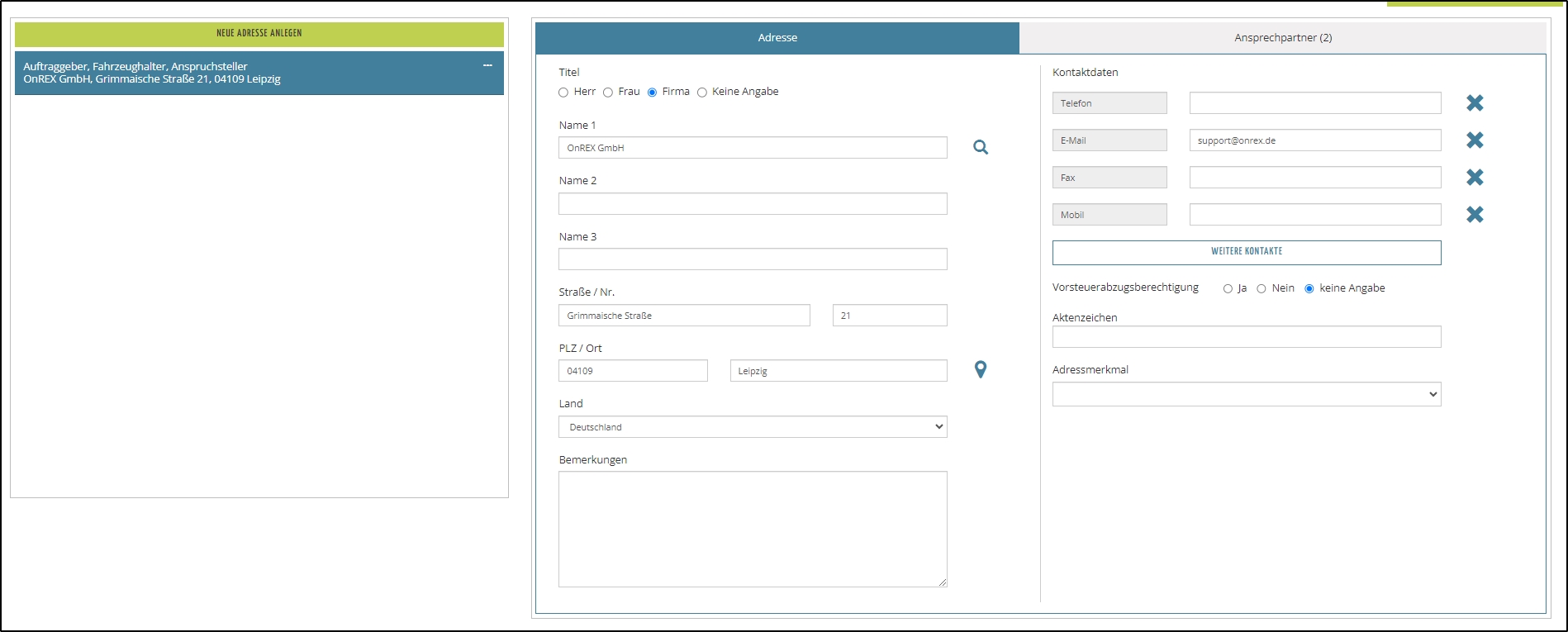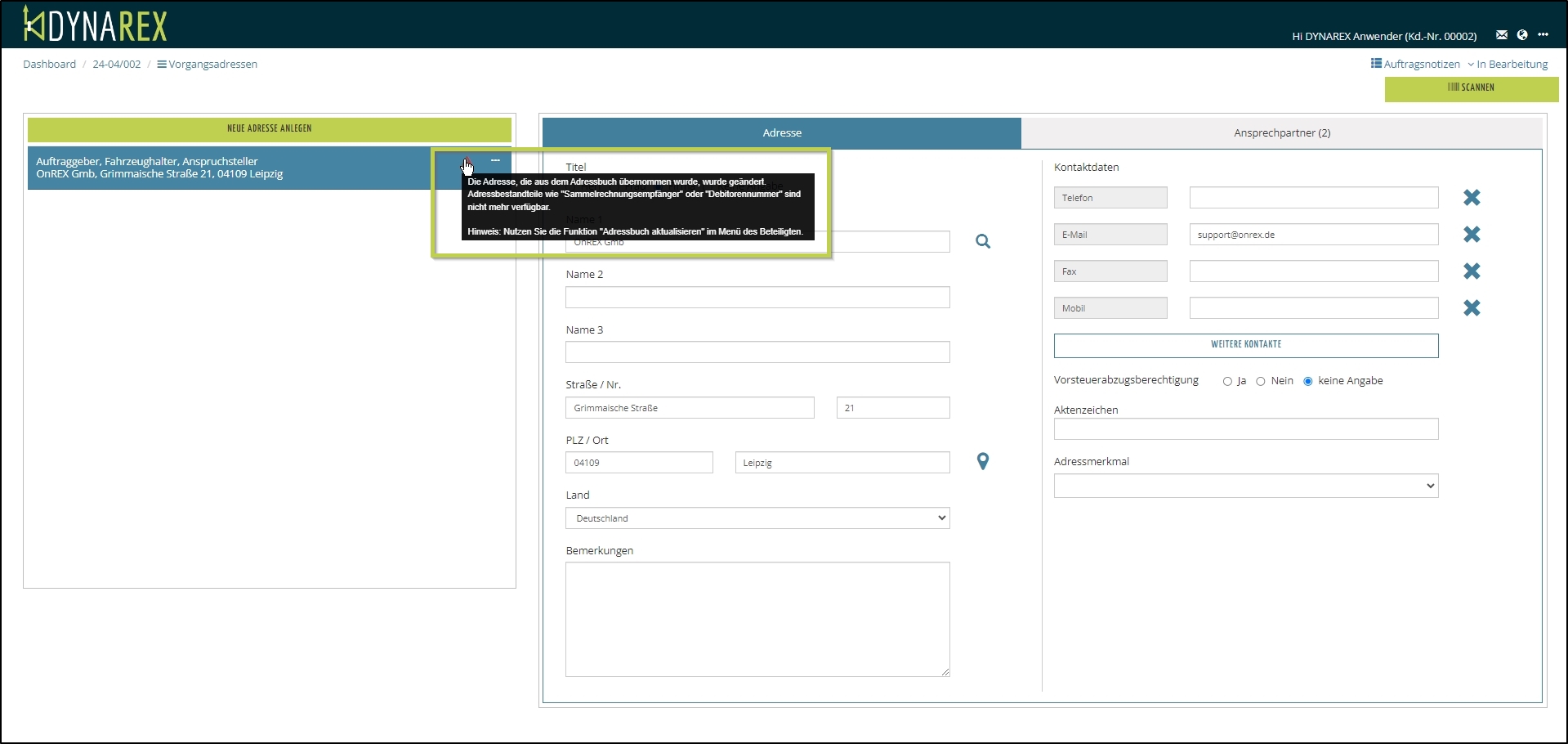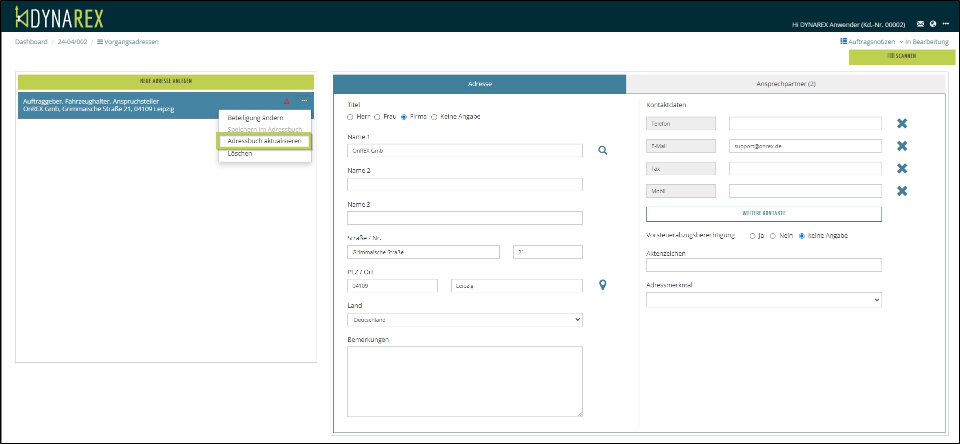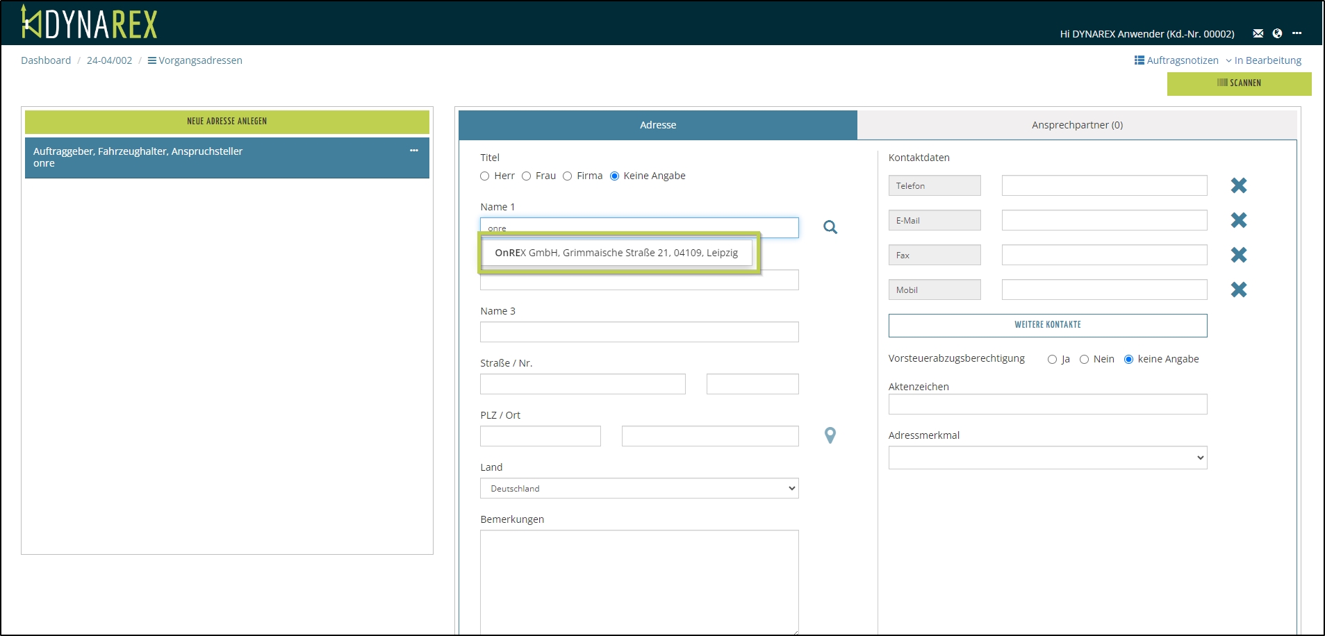 In DYNAREX haben Sie die Möglichkeit, Adressen im Adressbuch zu erfassen, zu speichern und in einen Vorgang zu übernehmen.