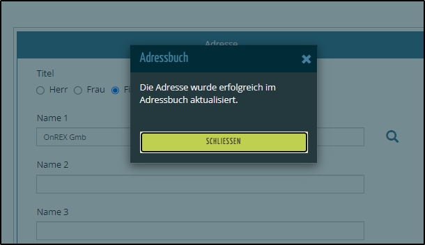 Nun fangen Sie an, im Feld „Name 1“ den Namen des Kontaktes zu tippen, das System schlägt Ihnen nun automatisch die Adresse vor