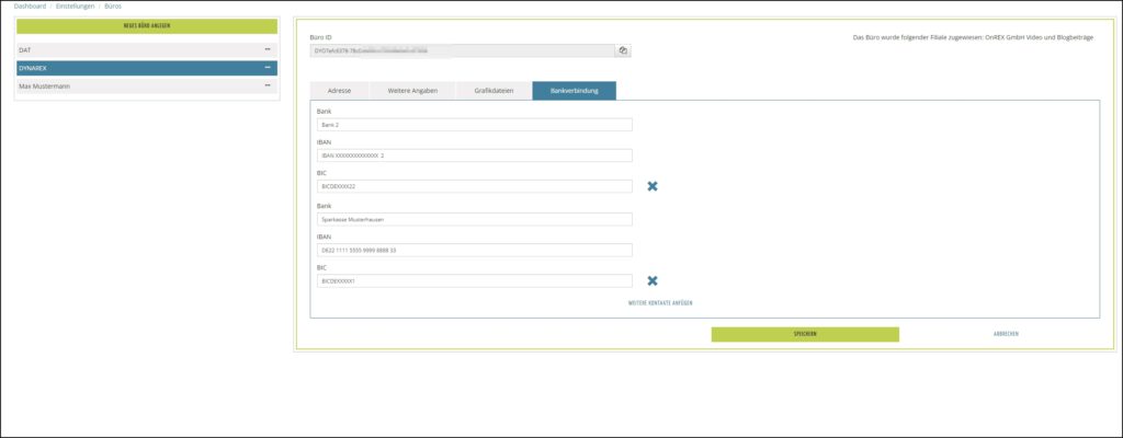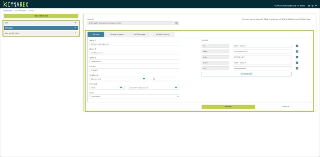 Hier sehen Sie im linken Bereich Ihr bereits angelegtes Büro bzw. Sie können sich weitere Büros durch Klick auf den Button NEUES BÜRO ANLEGEN anlegen.