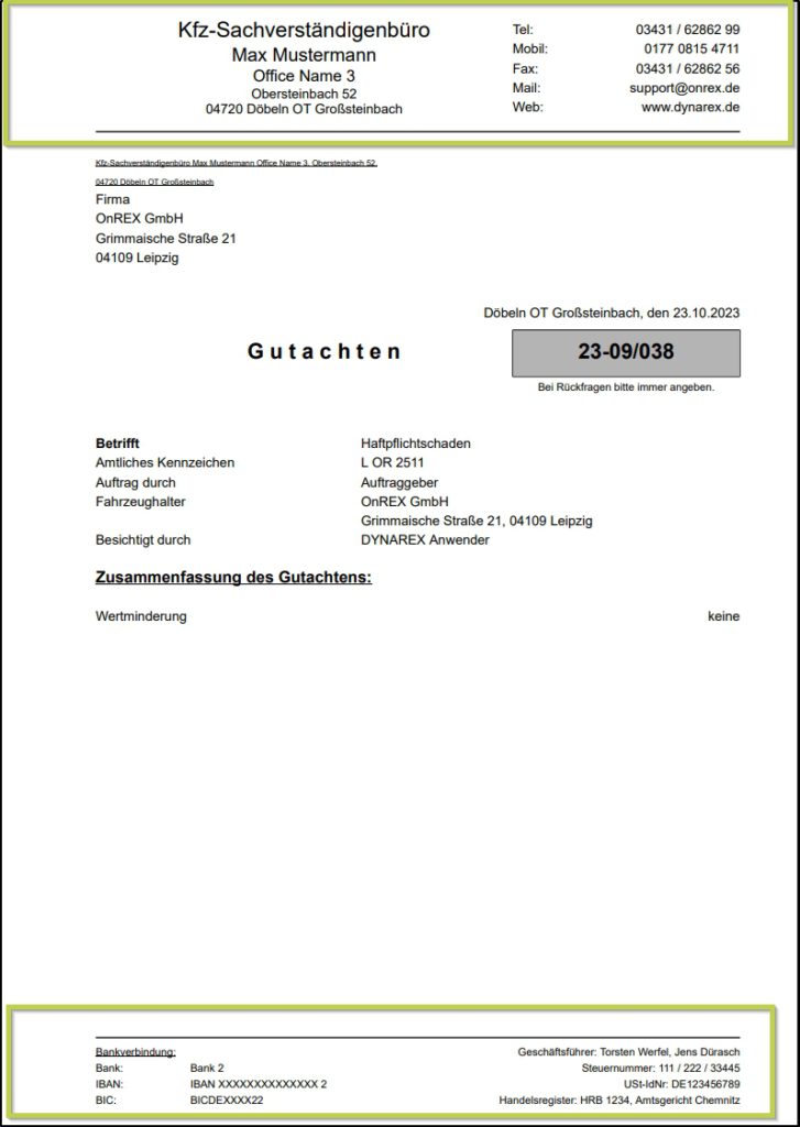 So sieht der Kopf- und Fußbereich Ihrer Dokumente mit den erfassten Daten im Bürodialog aus.