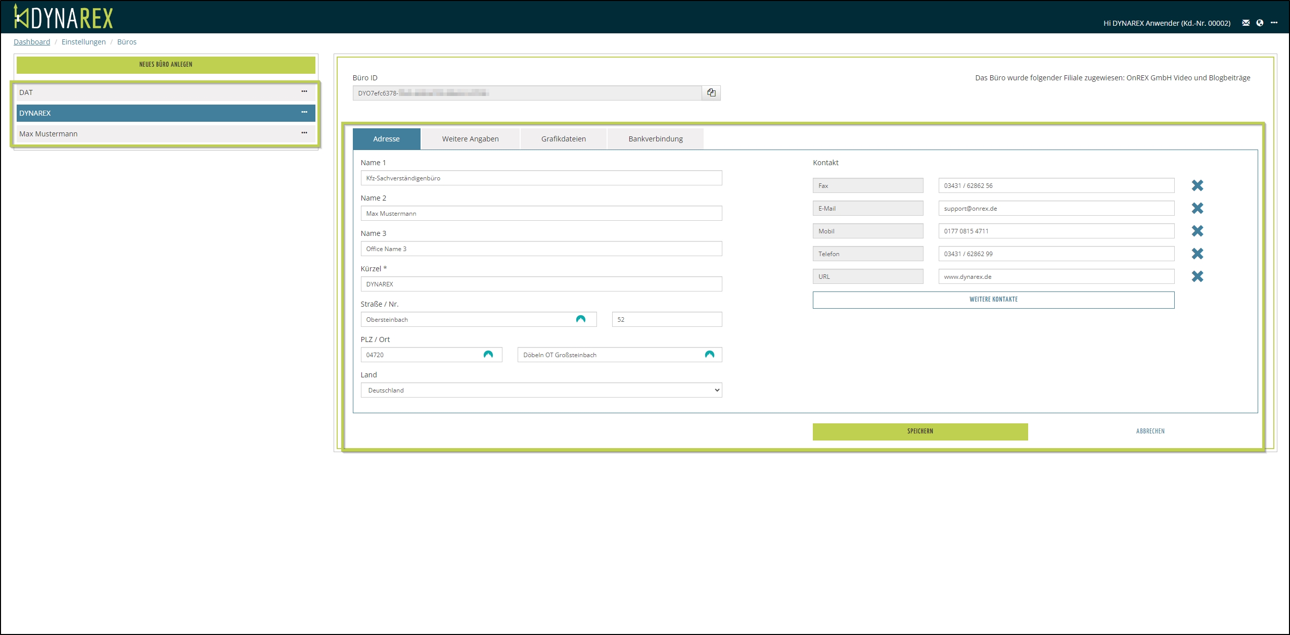Hier sehen Sie im linken Bereich Ihr bereits angelegtes Büro bzw. Sie können sich weitere Büros durch Klick auf den Button NEUES BÜRO ANLEGEN anlegen.
