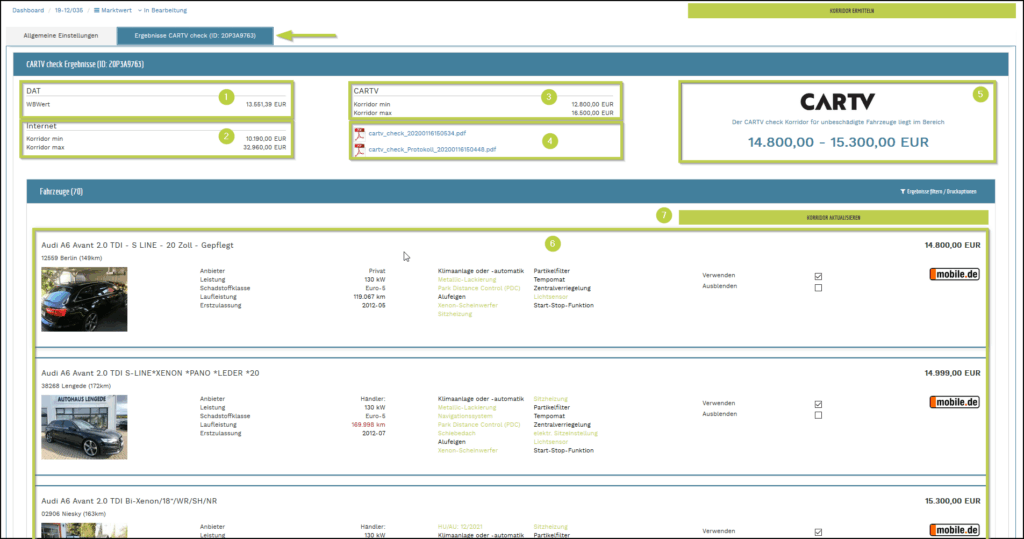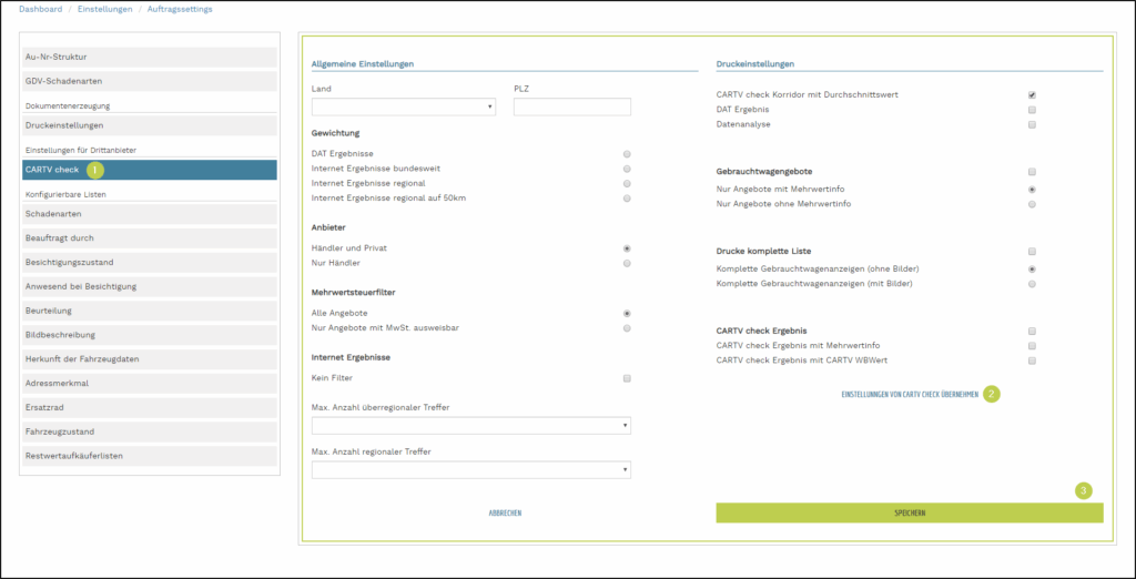 - über den Button Einstellungen von CARTV Check übernehmen (2) können Sie Ihre bei CARTV hinterlegten Einstellungen laden