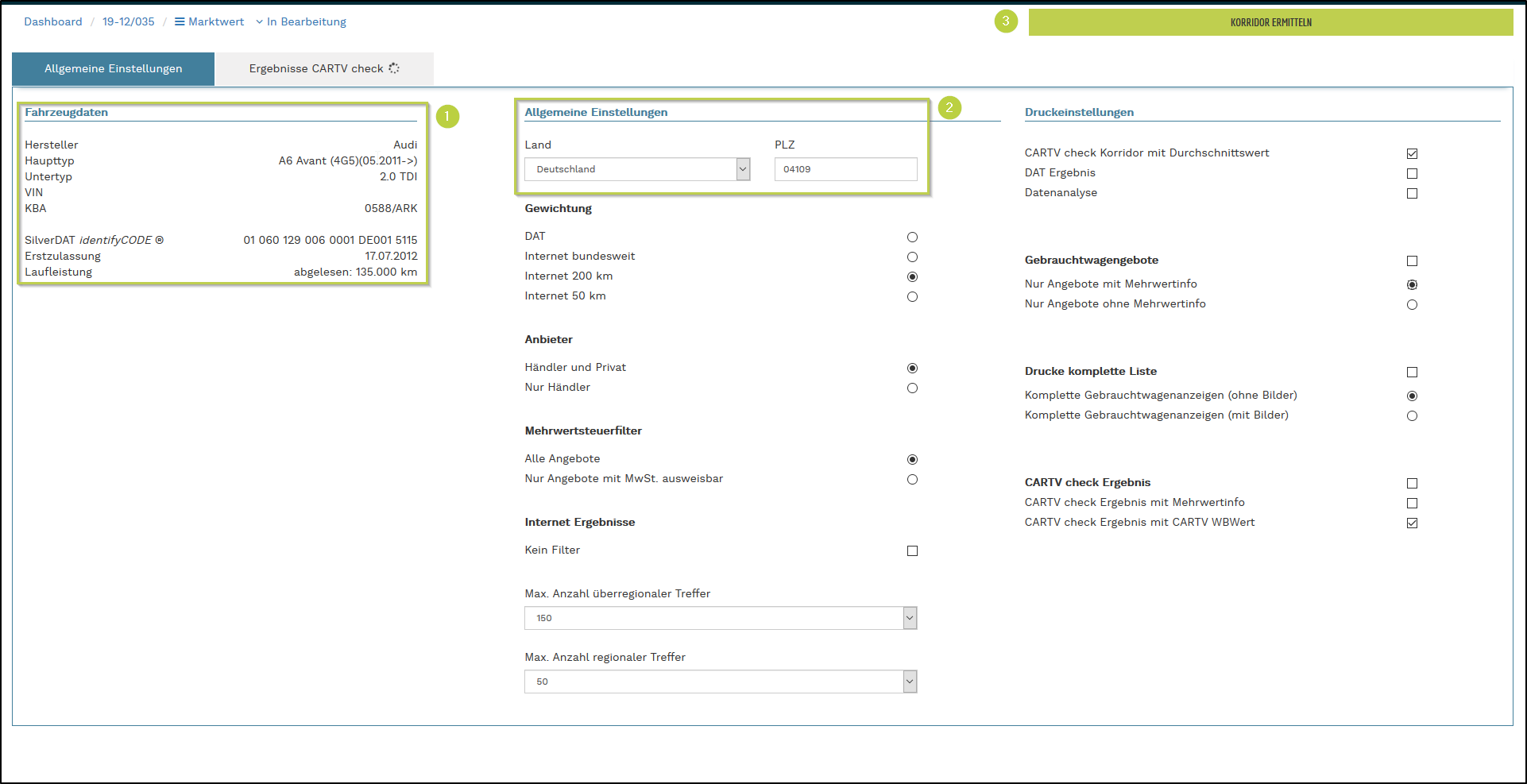 - über den Button Einstellungen von CARTV Check übernehmen (2) können Sie Ihre bei CARTV hinterlegten Einstellungen laden