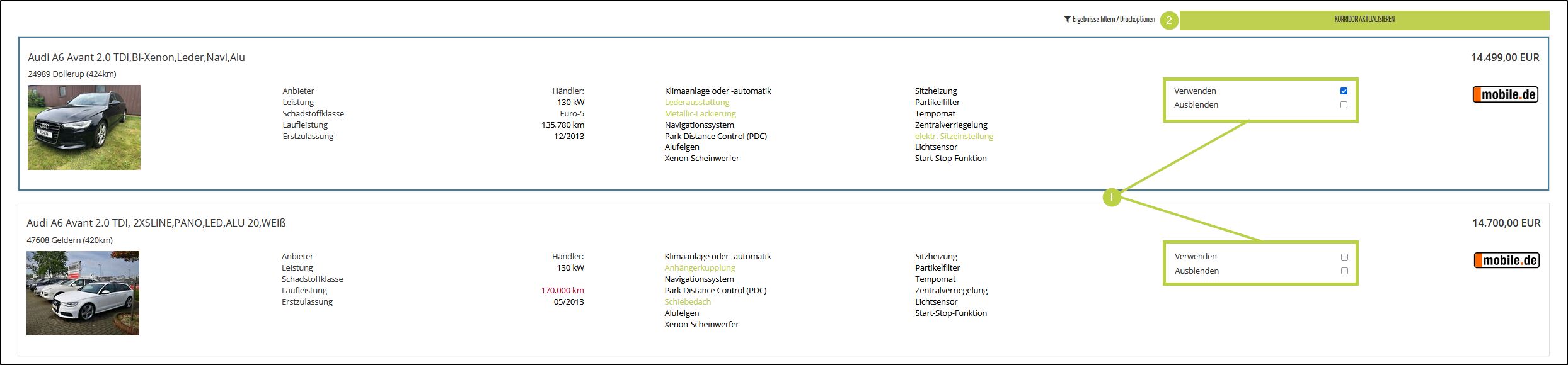 Weiterhin können selbst Fahrzeuge für die Verwendung im Protokoll einbinden oder ausschließen, in dem Sie bei dem gewählten Angebot den Haken Verwenden oder Ausblenden setzen (1) und anschießend den Korridor aktualisieren (2)