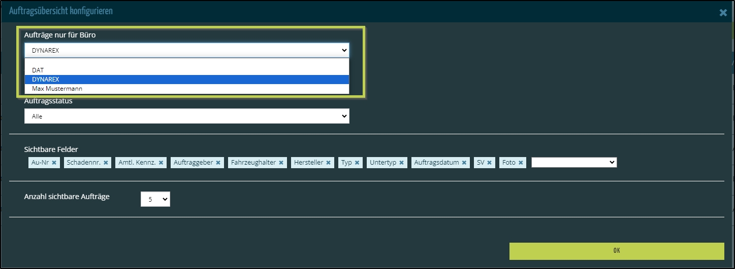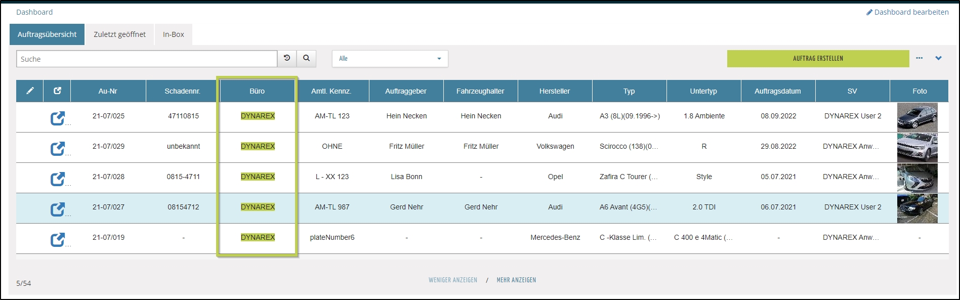 Im DYNAREX haben Sie die Möglichkeit, Aufträge nach einem bestimmten Büro zu filtern.