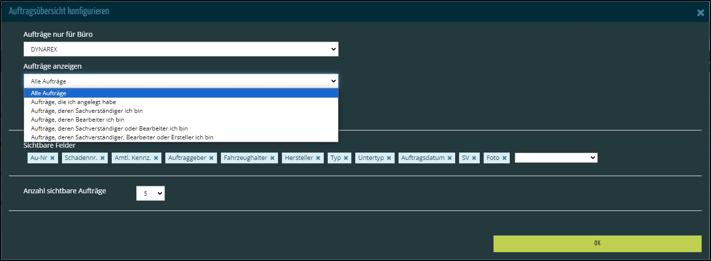 2. Aufträge anzeigen: Sollen Alle Aufträge, die Von mir erstellten Aufträge oder die in welchen der Anwender auch als Sachverständiger oder Bearbeiter hinterlegt wurde, angezeigt werden. ==> Wie Sie diesen Filter konfigurieren können zeigen wir Ihnen unterhalb dieses Screenshots.