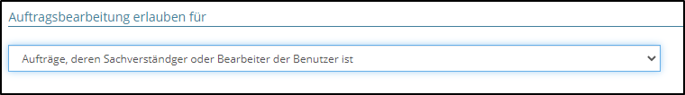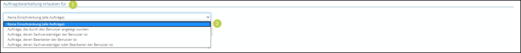 Aktivieren Sie jedoch im Bereich (1) Auftragsbearbeitung erlauben für  nur eine der 3 Optionen (2) z. Bsp. Aufträge, deren Bearbeiter der Anwender ist, werden auch nur diese Aufträge für diesem Benutzer angezeigt: