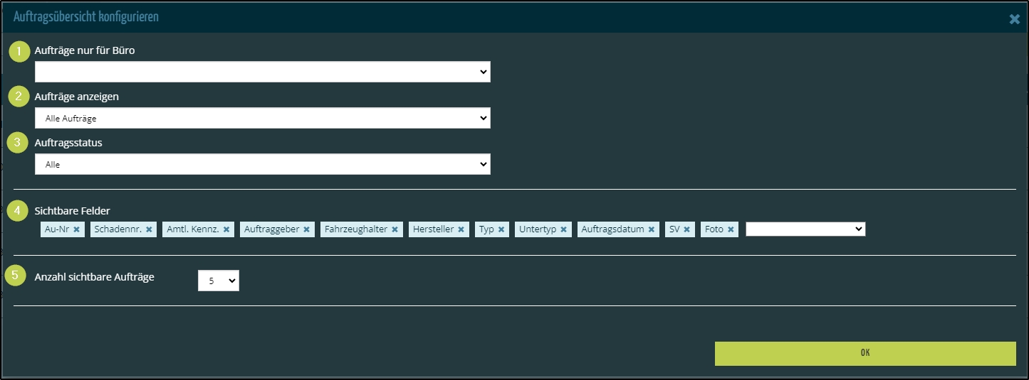 5. Anzahl sichtbare Aufträge: Hier können Sie entscheiden wieviel Aufträge in der Auftragsübersicht untereinander angezeigt werden sollen.