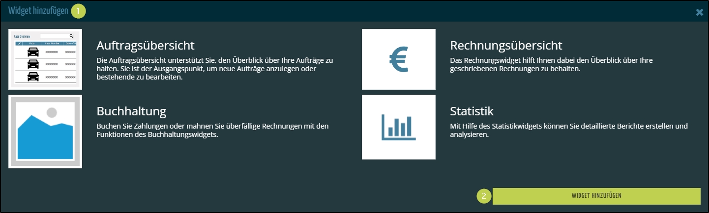 In diesem können Sie die verfügbaren Widgets (je nach Bestellung) einzeln hinzufügen (1.) und über den Button Widget hinzufügen (2.) in das Dashboard integrieren.