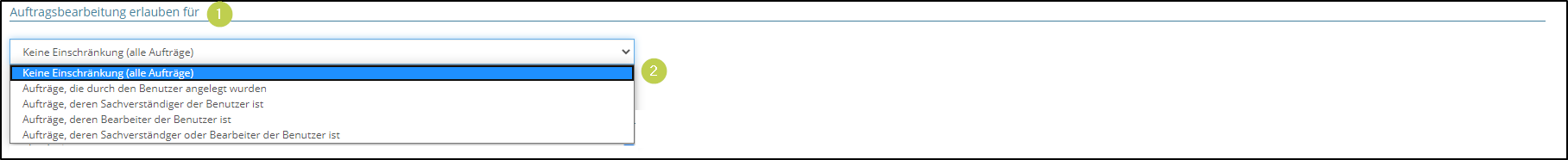 Aktivieren Sie jedoch im Bereich (1) Auftragsbearbeitung erlauben für  nur eine der 3 Optionen (2) z. Bsp. Aufträge, deren Bearbeiter der Anwender ist, werden auch nur diese Aufträge für diesem Benutzer angezeigt: