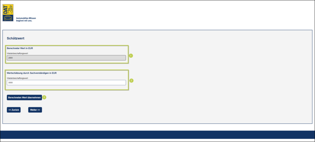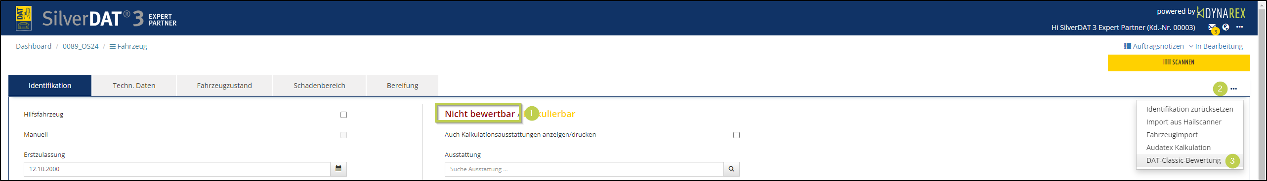 Liegen für das Fahrzeug keine DAT-Bewertungsdaten vor (1), können Sie über das 3-Punkte-Menü (2) auf die DAT-Classic-Bewertung umstellen (3).