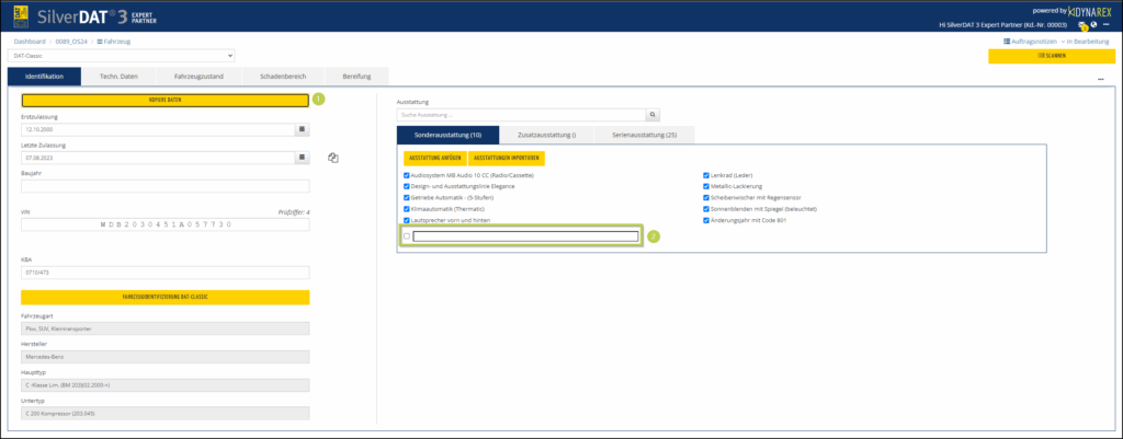 Mit der Umstellung können Sie die Fahrzeugdaten für die Classic-Bewertung kopieren (1). Sie können wie gewohnt Ausstattungsmerkmale (Sonderausstattung, Zusatzausstattung und Serienausstattung) erfassen (2).