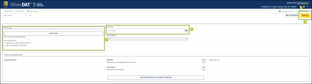 Hier sehen Sie erneut die erfassten Fahrzeugdaten und können bei Bedarf erneut auf die Fahrzeugseite wechseln (1), erfassen Sie den Stichtag (2) und klicken anschließend auf BEWERTEN (3).