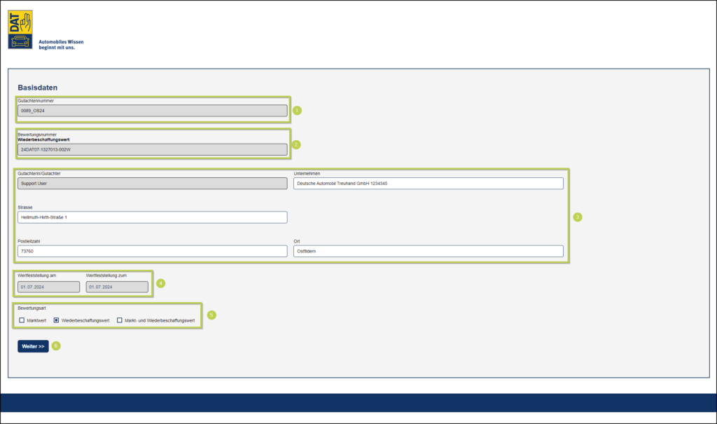 Hier sehen Sie Ihre Gutachtennummer (1), die Bewertungsnummer (2) sowie Ihre Kontaktdaten (3) und das gewählte Datum (4).
