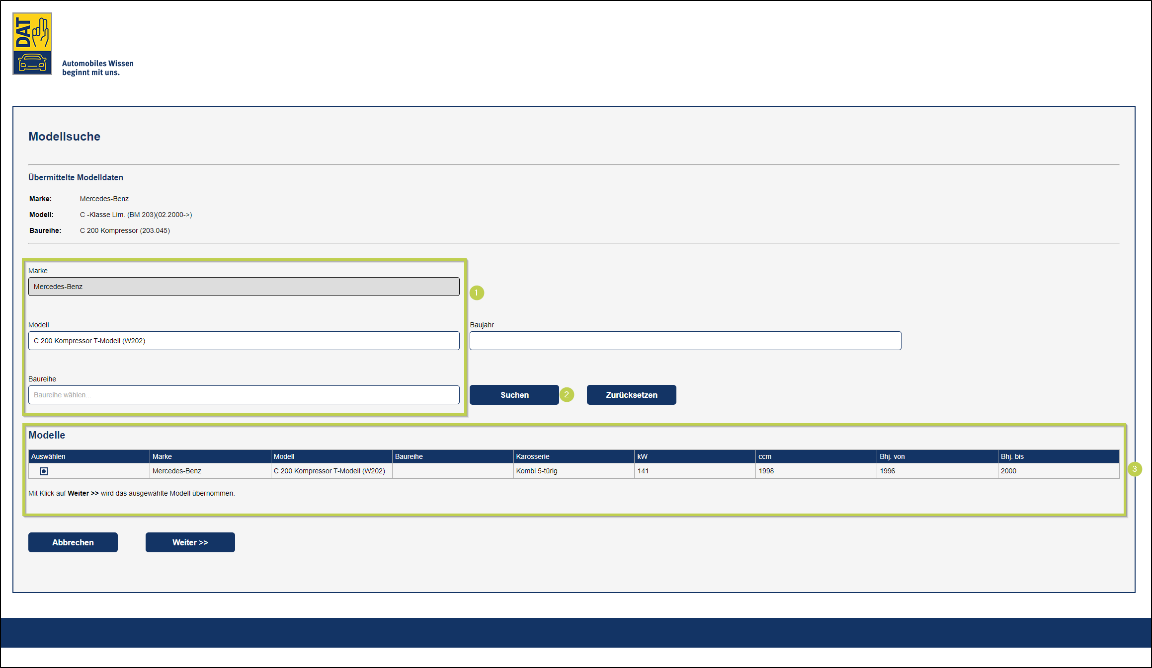 Wählen Sie die Marke, das Modell und Baureihe (1). Über die Listboxen können Sie dieses bequem suchen und klicken Sie anschließend auf Suchen (2).