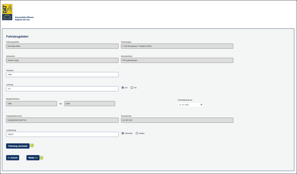 Nach Klick auf Weiter werden Ihnen nochmal die Fahrzeugdaten angezeigt und können ggf. ergänzt werden.