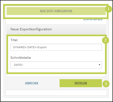Anschließend erstellen Sie eine neue Konfiguration durch Klick auf NEUE DATEV-KONFIGURATION (1), erfassen einen Titel (2) und bestätigen Ihre Eingaben mit Klick auf ERSTELLEN (3).
