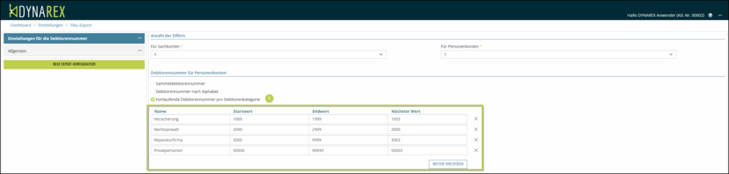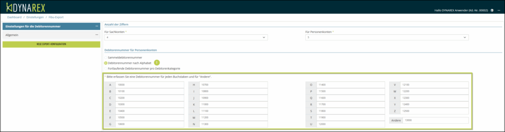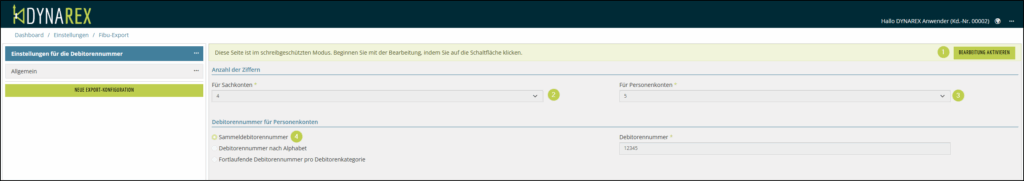 Bei der Zuordnung der Debitorennummer können Sie festlegen, ob alle Debitoren auf eine Nummer geschrieben werden (4)…
