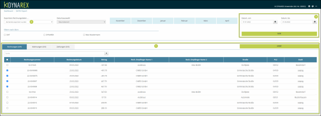 Das Suchfeld mit der Selektion von Rechnungen (1) erscheint wie beschrieben nur bei der Auswahl die bereits exportiert wurden (2) nach Klick auf SUCHE nach der Auswahl des Datumbereiches (3).