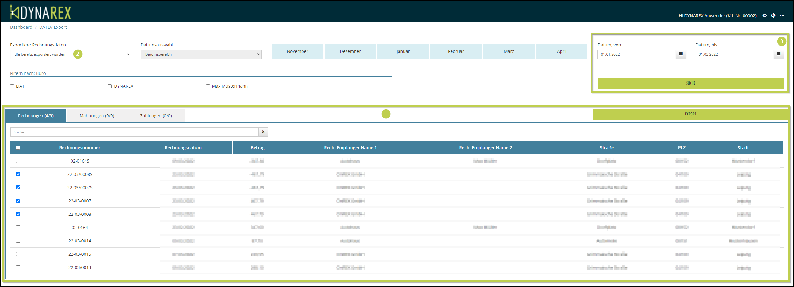 Das Suchfeld mit der Selektion von Rechnungen (1) erscheint wie beschrieben nur bei der Auswahl die bereits exportiert wurden (2) nach Klick auf SUCHE nach der Auswahl des Datumbereiches (3).