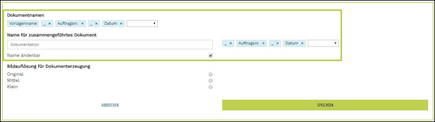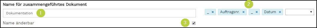 Hier können Sie noch zusätzlich die Option Name änderbar (3) aktivieren. Mit dieser Funktion wird bei der Dokumenten-Erzeugung ermöglicht, selbst zu entscheiden, ob der Dateiname wie vordefiniert erzeugt werden soll oder ob Sie diesen doch noch anders benennen möchten.