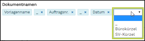 Den vordefinierten Dateinamen können Sie aber auch individualisieren, indem Sie die bestehenden Felder per Drag & Drop an die gewünschte Position schieben oder Sie wählen weitere Felder aus dem Listenfeld aus: