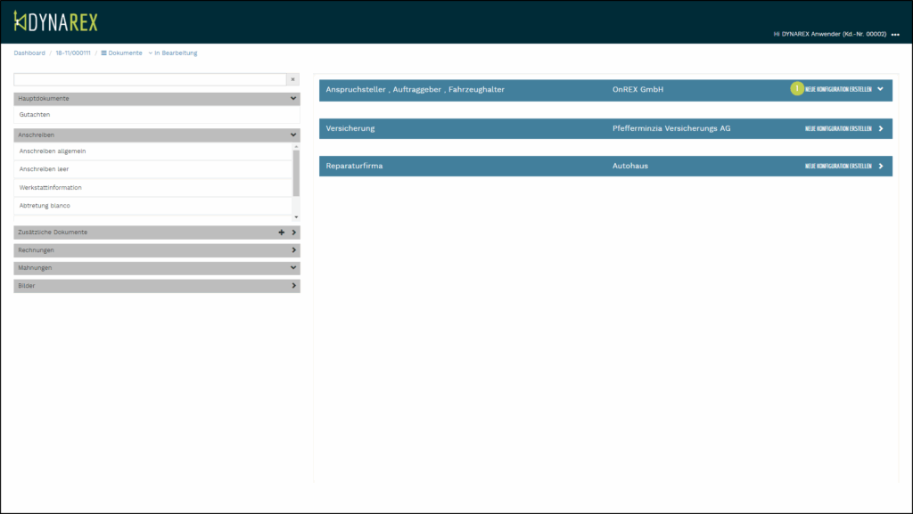 Gruppiert ist nach Hauptdokumente, Anschreiben, zusätzliche Dokumente, Rechnungen, Mahnungen und Bilder.