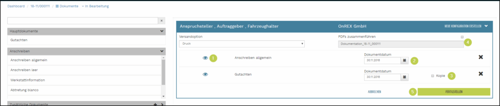 Nach Klick auf FERTIGSTELLEN werden die Dokumente erzeugt und dauerhaft abgelegt.
