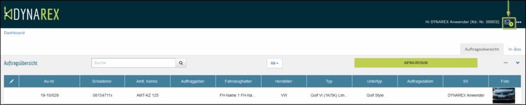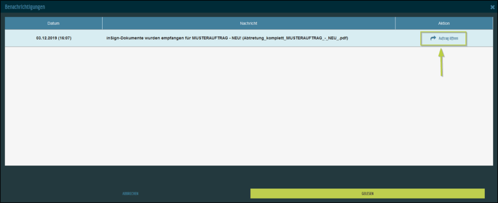Die Einzelnachricht wird als gelesen markiert und der zugehörige Auftrag wird geöffnet. - Klick auf „GELESEN“: