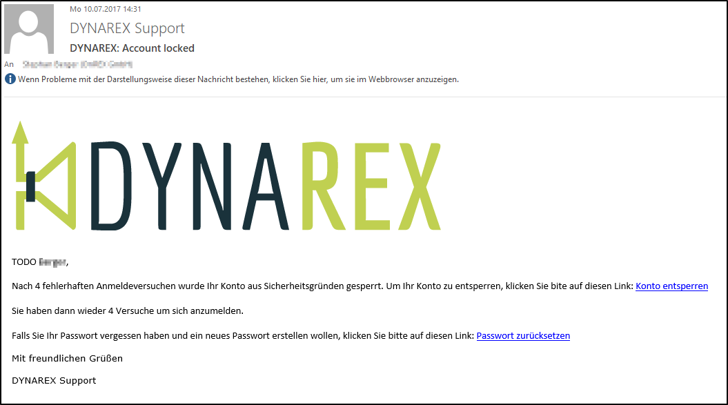 Auf diese E-Mail Adresse wird anschließend eine DynaREX Support E-Mail gesendet. Prüfen Sie bitte Ihr Postfach.