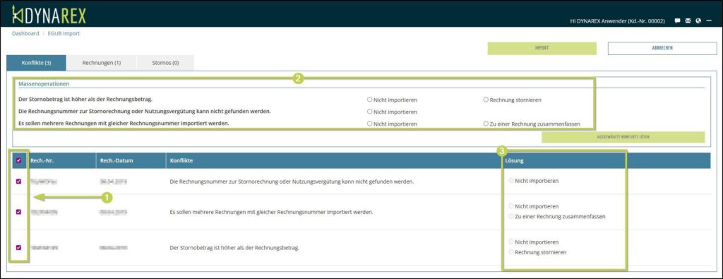 Sie können gezielt nach Rechnungen suchen (1), einzelne Rechnungen vom Import abwählen (2) und den Import durchführen (3).