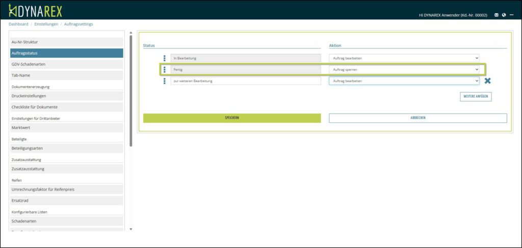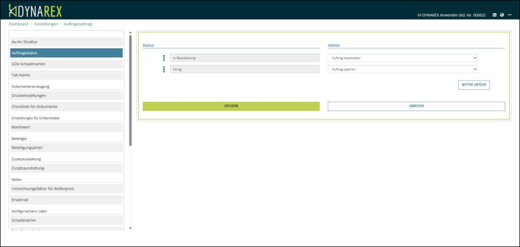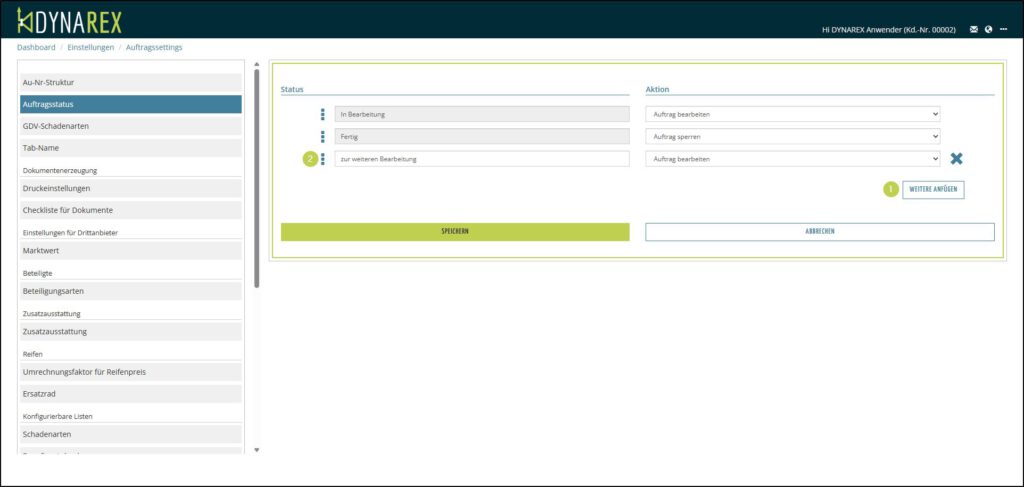 Erzeugen Sie durch Klick auf Button WEITERE ANFÜGEN (1) einen neuen Datensatz und erfassen Sie den benötigten Auftragsstatus (2).
