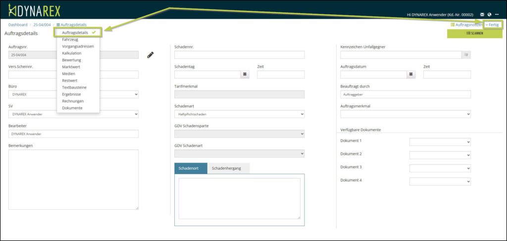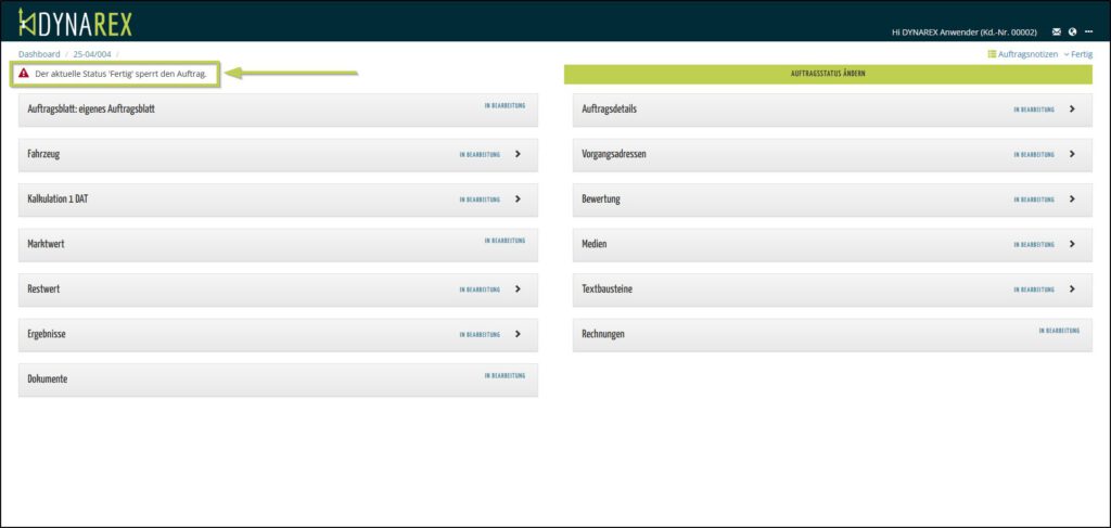 Wählen Sie den Auftragsstatus Fertig aus, wird der Auftrag für die weitere Bearbeitung gesperrt: