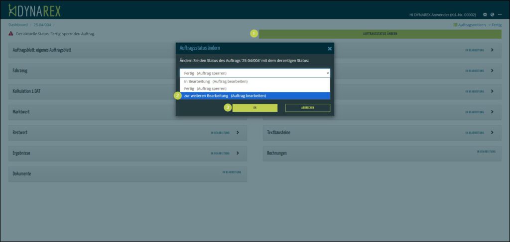 Um den Auftrag für eine weitere Bearbeitung zu wieder entsperren, klicken Sie auf AUFTRAGSSTATUS ÄNDERN (1) und wählen anschließend den gewünschten Auftragsstatus (2) im Dialog aus und bestätigen Ihre Eingabe mit OK (3).