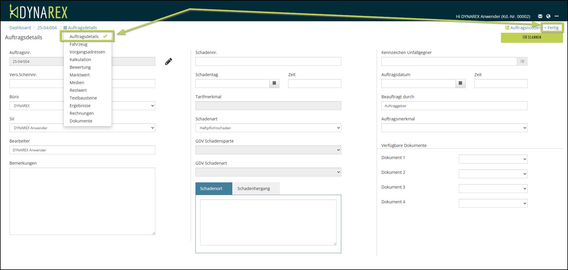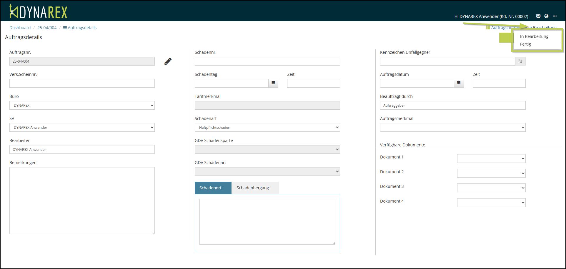 Wählen Sie den Auftragsstatus Fertig aus, wird der Auftrag für die weitere Bearbeitung gesperrt: