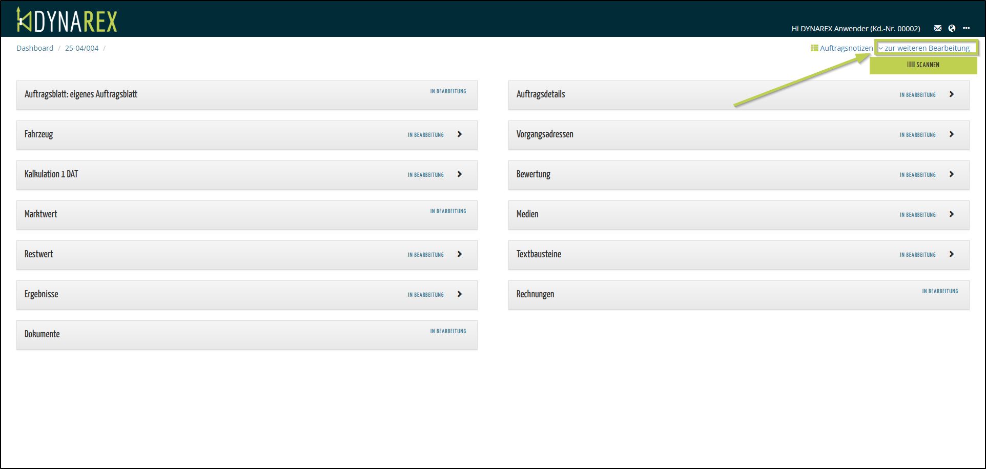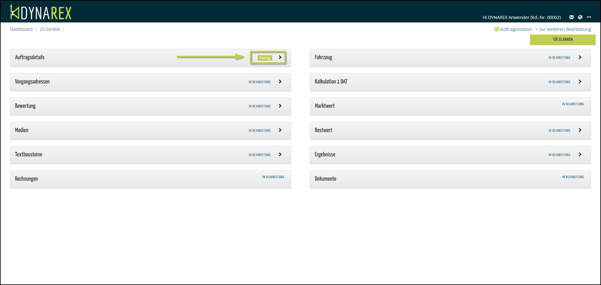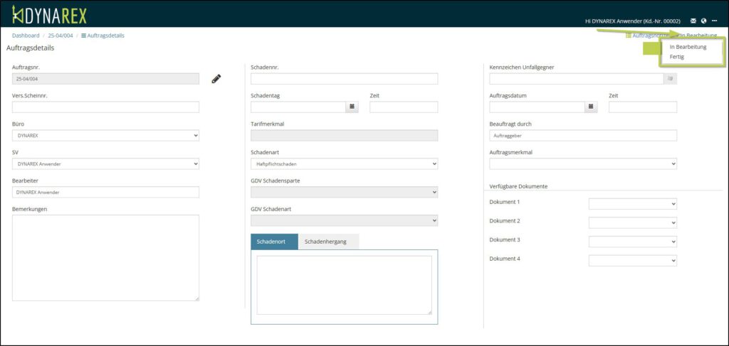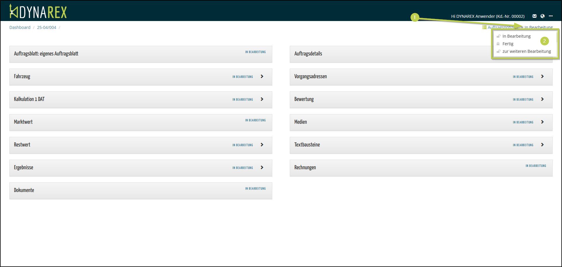 Auch hier haben Sie die Möglichkeit den Bearbeitungsstatus von in Bearbeitung in Fertig zu wählen und ggf. auch wieder zurück.