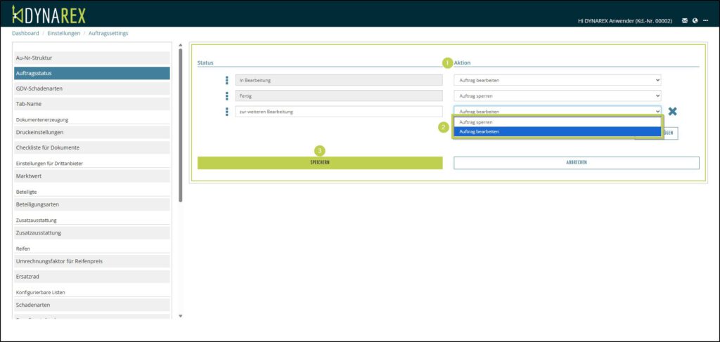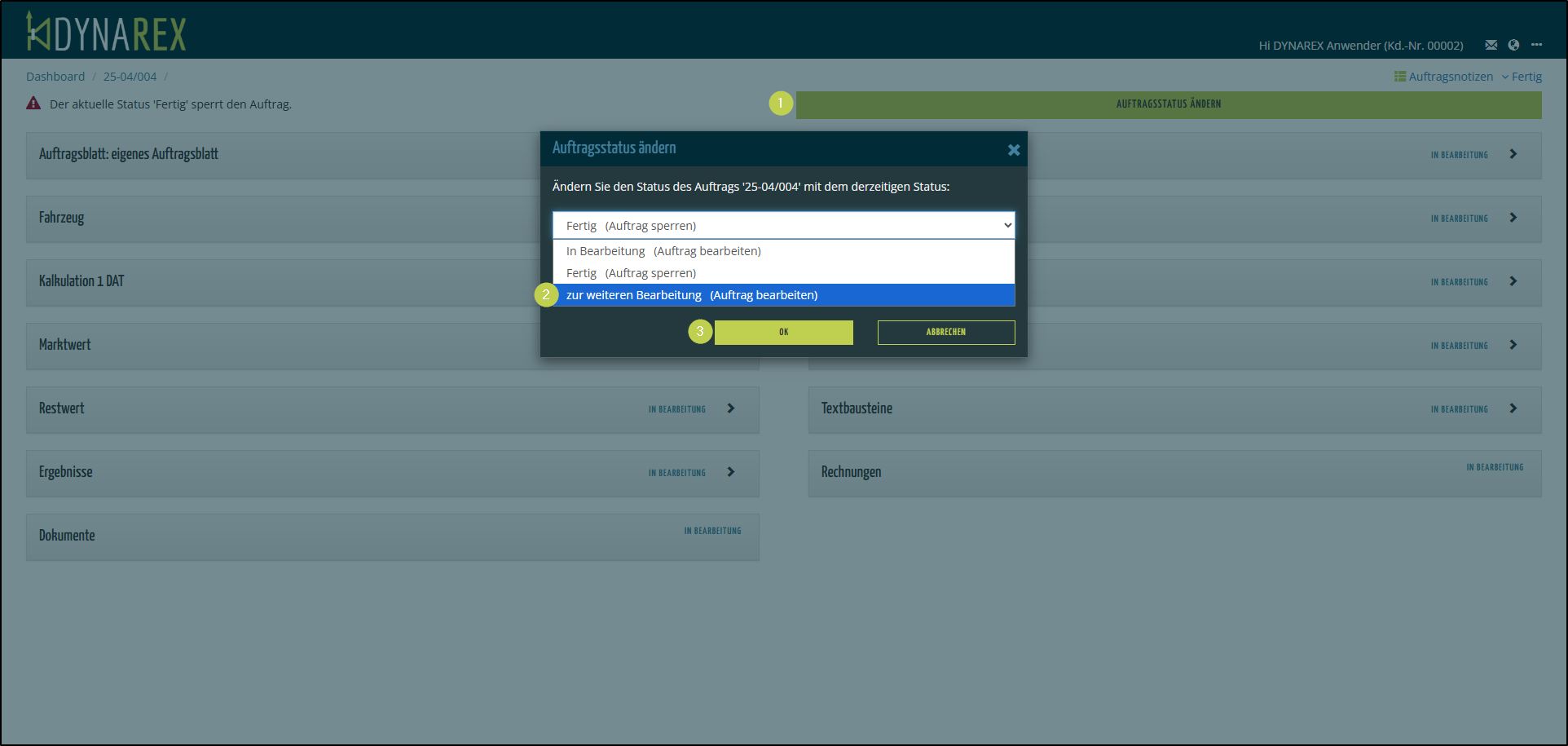 Um den Auftrag für eine weitere Bearbeitung zu wieder entsperren, klicken Sie auf AUFTRAGSSTATUS ÄNDERN (1) und wählen anschließend den gewünschten Auftragsstatus (2) im Dialog aus und bestätigen Ihre Eingabe mit OK (3).