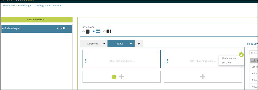 Im zweiten Schritt empfehlen wir Ihnen die Tab-Struktur zu definieren. Mit Klick auf den Button (2) können Sie einen weiteren Tab der Eingabemaske hinzufügen.