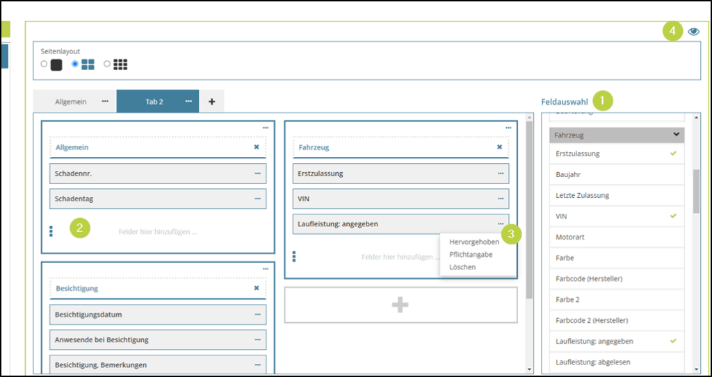 Tipp: Möchten Sie ein Feld mit Fettschrift hervorheben oder zum Pflichtfeld erklären, dann können Sie dies über das 3-Punkte Menü (3) am Feld einstellen. Mit LÖSCHEN entfernen Sie das Feld wieder aus der Gruppe.