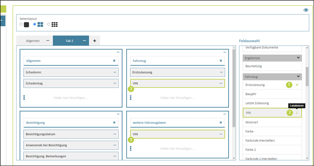 Anhand eines grünen Hakens (1) können Sie erkennen, ob das Feld bereits auf der „eigenen Eingabemaske“ eingefügt wurde. Sollten Sie das Feld bereits mehrfach hinzugefügt haben, wird stattdessen anhand der Anzahl (2) angezeigt. Mit Klick auf den grünen Haken/Zahl (1 oder 2), wird das Feld in der Zusammenstellung hervorgehoben (3).