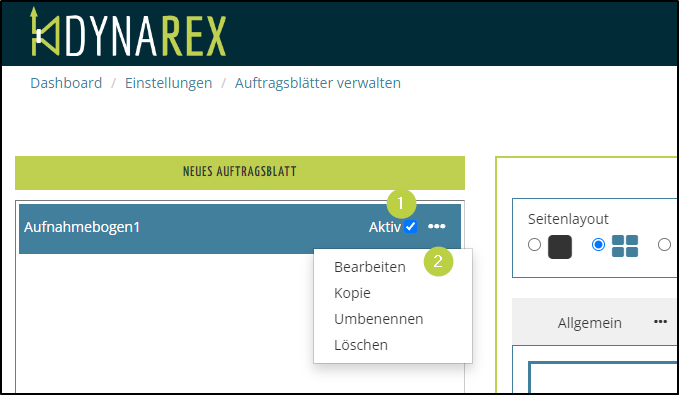 Navigieren Sie zu „Systemeinstellungen\Auftrag\Auftragsblätter verwalten“.