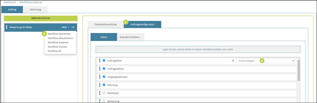 Wechseln Sie auf den Tab „Auftragskonfiguration / Seiten“ und aktivieren die Seite „Auftragsblatt“ (2). Über die Auswahl (3) können Sie nun die „eigene Maske“ auswählen, die in diesem Workflow verwendet werden soll.